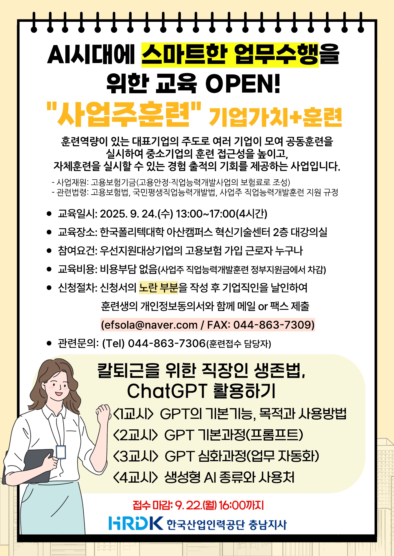 한국산업인력공단에서 주최하는 「ChatGPT와 생성형 AI 실무 활용 교육」에 대해 안내해드리오니, 자세한 내용은 하단 포스터와 첨부파일을 참고해주시기 바랍니다