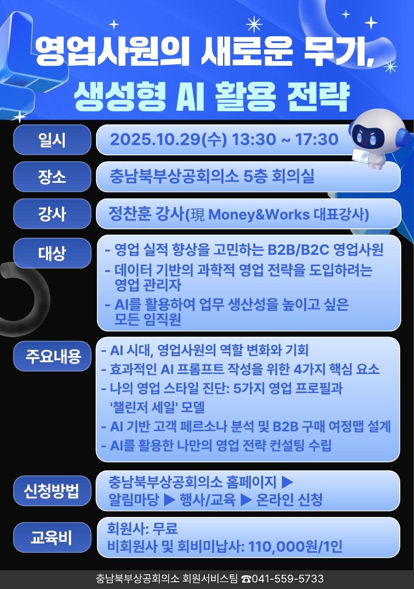 ※ 본 교육에는 일부 실습이 포함되어 있으므로, 원활한 참여를 위해 구글 계정을 미리 준비해 주시고, 휴대전화에 Google Gemini 및 ChatGPT 프로그램을 설치하여 참석해 주시기 바랍니다. 1. 일시: 2025. 10. 29.(수) 13:30 ~ 17:30(4시간) 2. 장소: 충남북부상공회의소 5층 회의실 3. 대상: 생성형 AI를 활용해 영업 성과와 전략 수립 능력 강화를 희망하는 영업 담당자(※선착순 40명) 4. 교육비 - 회비납부업체: 무료 - 회비미납업체 및 비회원사 : 금110,000원/1인 ※ 입금 후 확인 전화 및 사업자등록증 사본 FAX (041-556-7137) ※ 세금계산서는 입금 날짜로 발행 ※ 교육 당일 취소 시 환불 불가