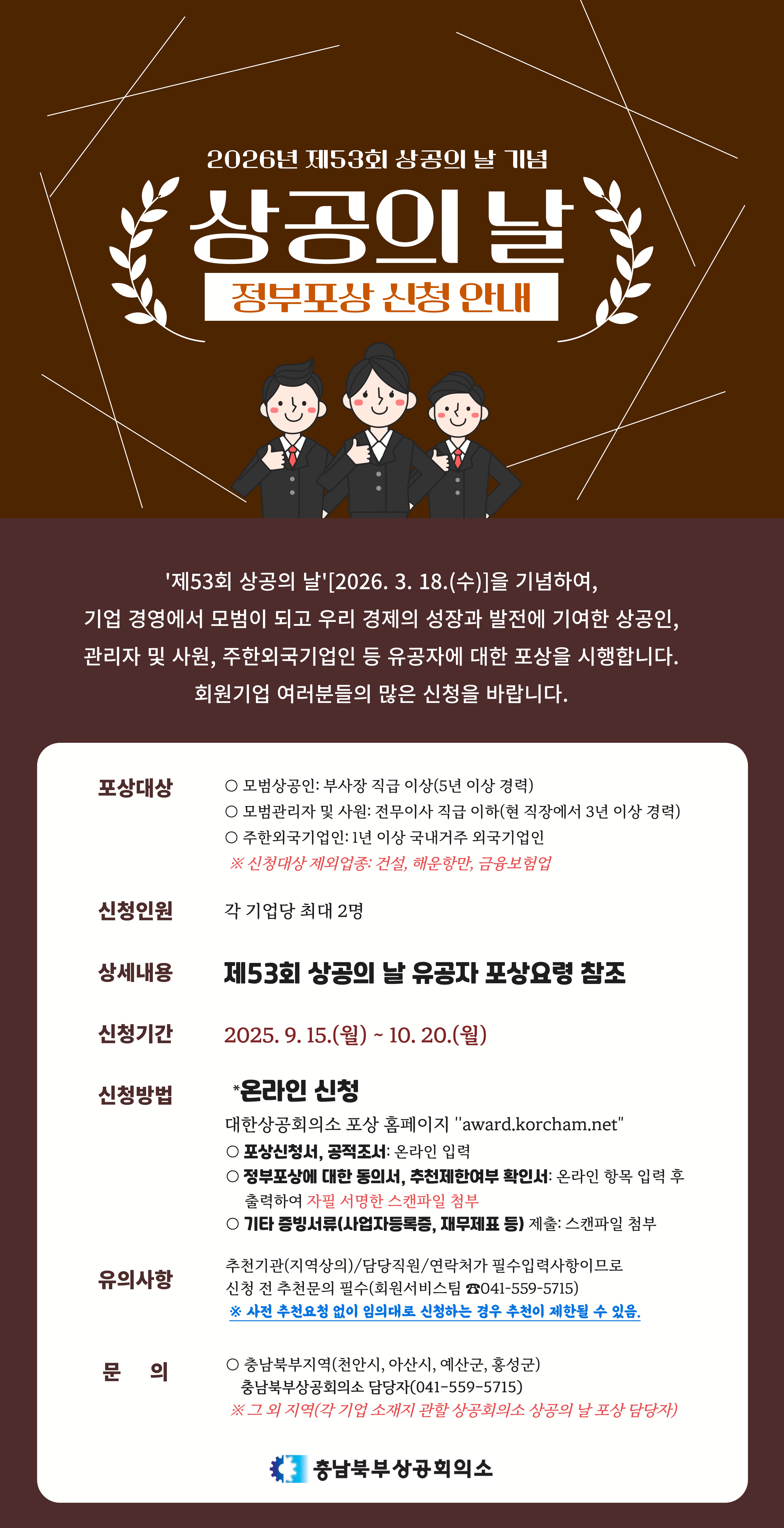 본 회의소에서는 제53회 상공의 날('26. 3. 18.)을 기념하여 타의 모범이 되는 상공인과 관리자 및 사원, 주한 외국기업인을 발굴 포상하고자 안내드리오니 많은 관심과 신청바랍니다.