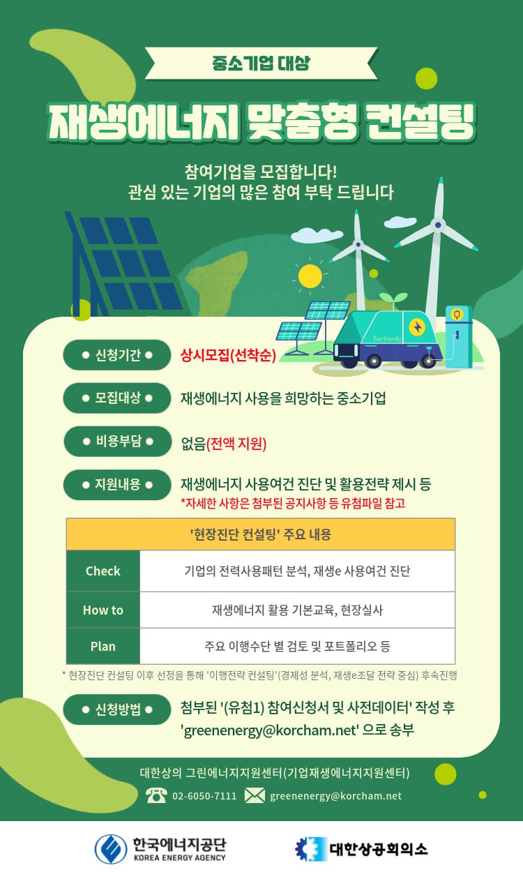 ◎ 신청기간: 상시모집(선착순) ◎ 신청방법: 그린에너지 지원센터 이메일(greenenergy@korcham.net) 제출 ◎ 지원대상: 재생에너지 사용을 희망하는 중소기업 ◎ 지원내용: 재생에너지 사용여건 진단 및 활용전략 제시 등 ◎ 비용부담: 없음(전액지원) ◎ 사업기간: 선정일 ~ 2026. 5. 29. ◎ 사업목적: ① 기업의 재생e 활용에 대한 인식 개선 및 참여 유도 ② 기업의 재생e 사용여건 진단 및 이행전략 제시 ③ 재생에너지 보급확대 및 기업의 탄소중립 실천지원 ◎ 문의처: 대한상의 그린에너지지원센터 (전화) ☎02-6050-7111 (이메일) greenenergy@korcham.net