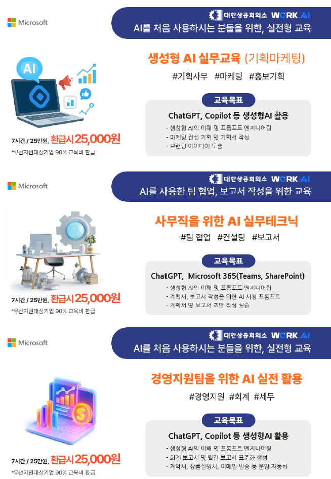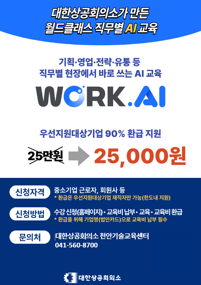 대한상공회의소 충남인력개발원에서는 재직자를 대상으로 하는 AI교육을 실시하고자 합니다. 본 교육은 기획, 영업, 전략, 유통 등 직무별로 현장에서 바로 쓸 수 있는 다양한 AI교육으로 우선지원대상기업 재직자의 경우 90% 환급 지원을 받을 수 있습니다. 이와 관련하여 다음과 같이 안내드리오니 회원사 여러분의 많은 관심과 참여 바랍니다.