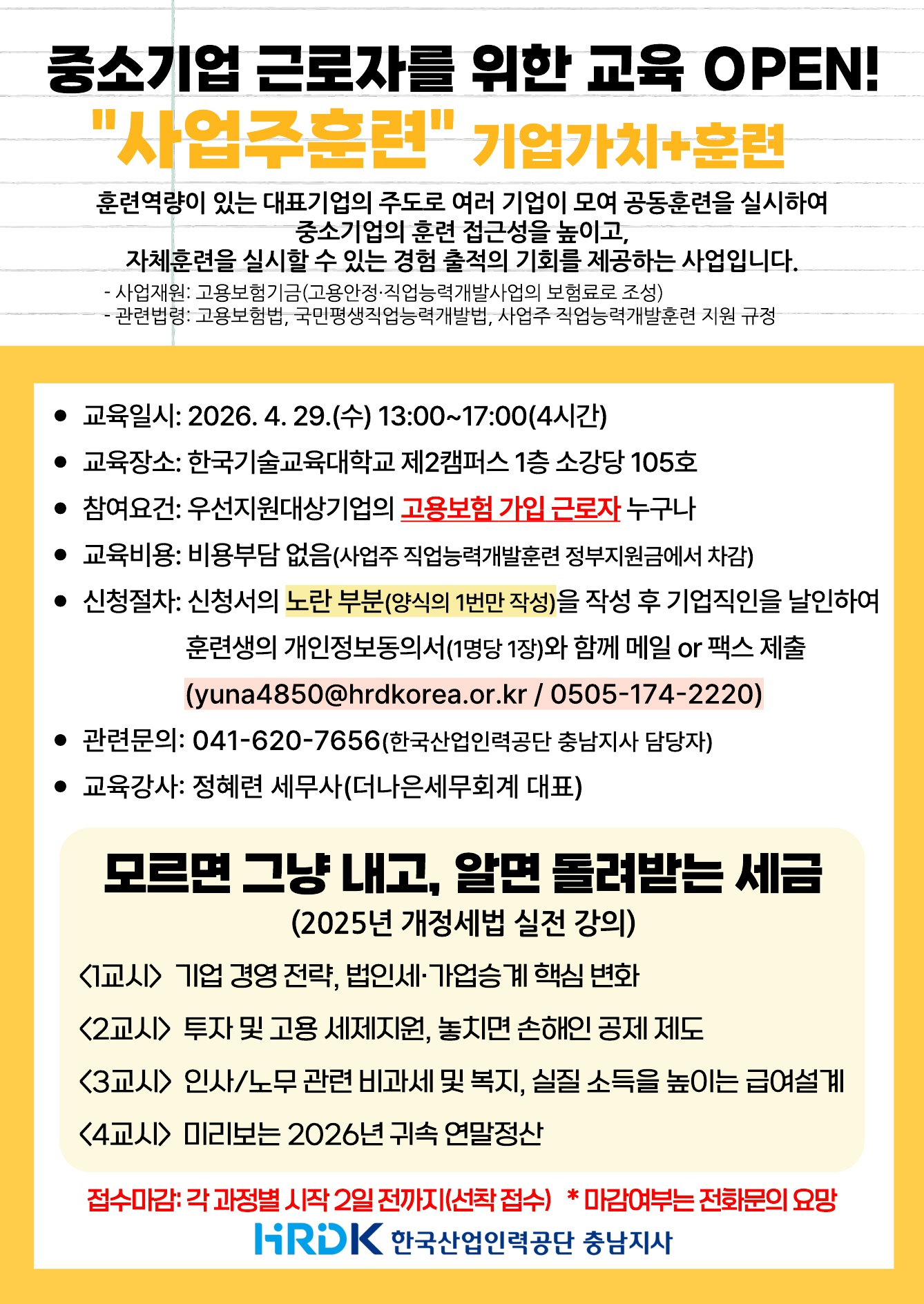 | 제목 | [한국산업인력공단] 기업가치플러스훈련(세무) 교육 안내 | ||