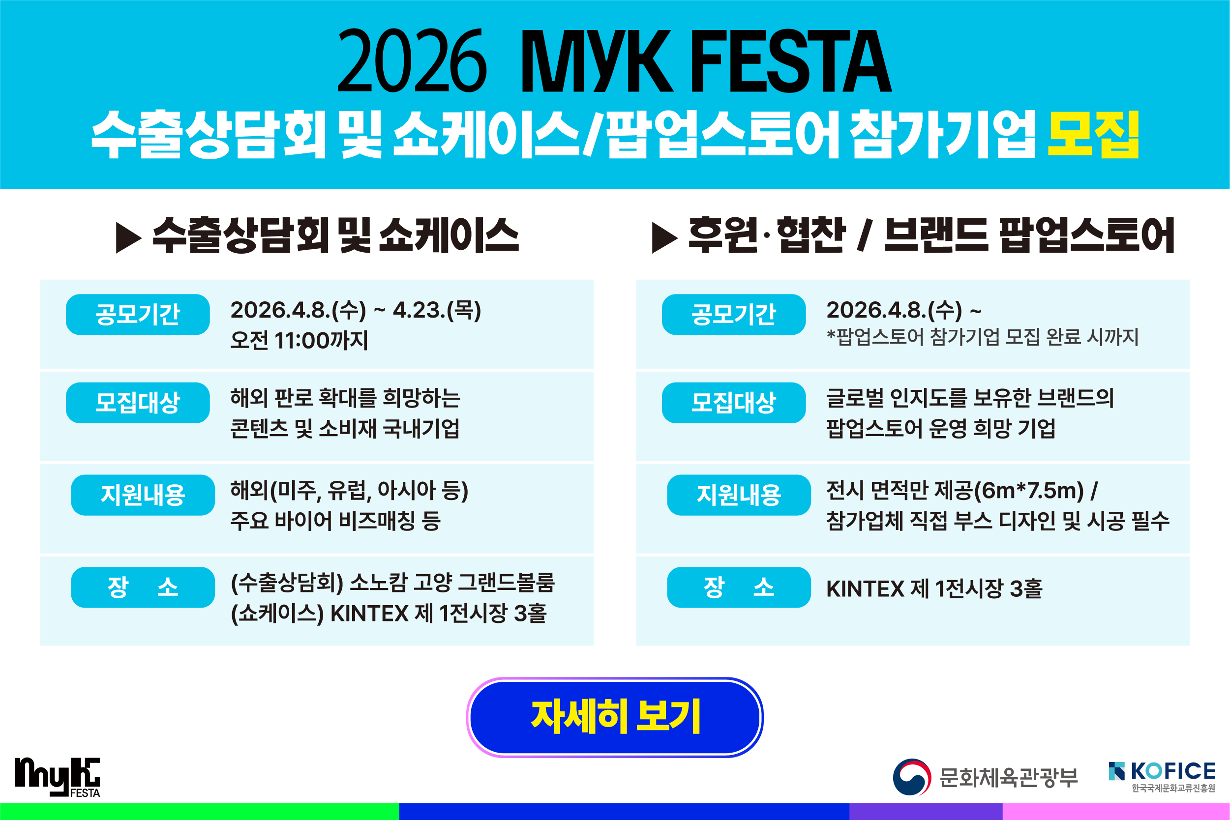 | 제목 | 2026 MyK FESTA 수출상담회 및 쇼케이스/팝업스토어 참가기업 모집 | ||