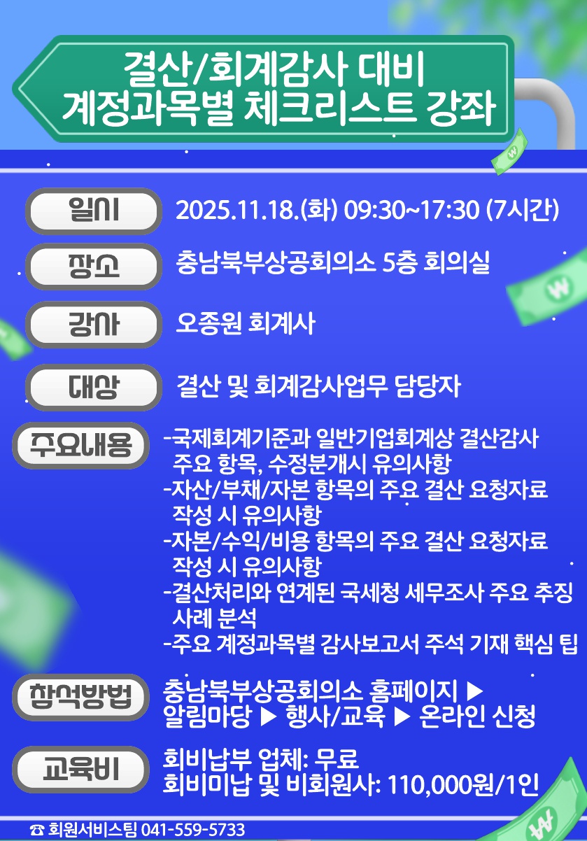 1. 일시: 2025. 11. 18.(화) 09:30 ~ 17:30(7시간) 2. 장소: 충남북부상공회의소 5층 회의실 3. 대상: 기업체 결산 및 회계 담당자(※ 선착순 40명) 4. 교육비 - 회비납부업체: 무료 - 회비미납업체 및 비회원사 : 금110,000원/1인 ※ 입금 후 확인 전화 및 사업자등록증 사본 FAX (041-556-7137) ※ 세금계산서는 입금 날짜로 발행 ※ 교육 당일 취소 시 환불 불가 ※ 자세한 내용은 공문을 통해 확인하여 주시기 바랍니다.