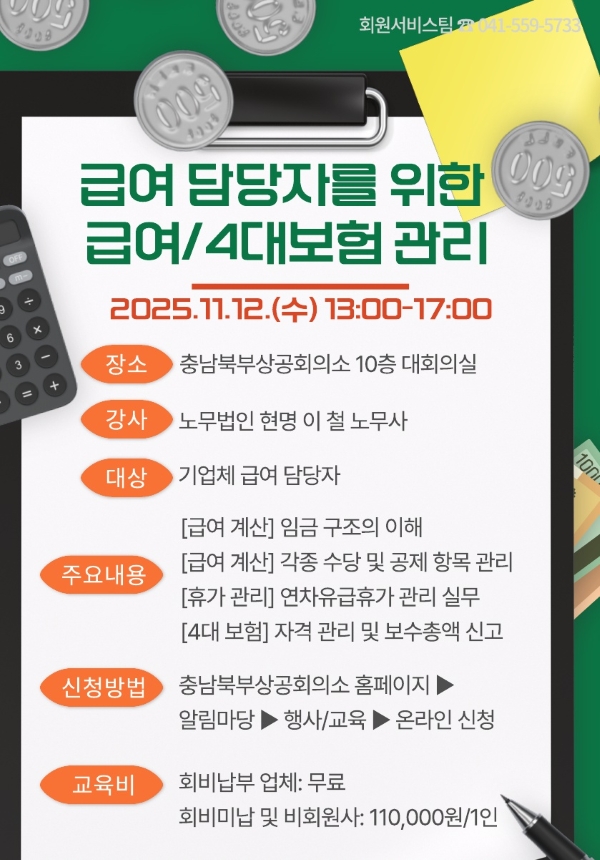 1. 일시: 2025. 11. 12.(수) 13:00 ~ 17:00(4시간) 2. 장소: 충남북부상공회의소 10층 대회의실 3. 대상: 기업체 급여 담당자 4. 교육비 - 회비납부업체: 무료 - 회비미납업체 및 비회원사 : 금110,000원/1인 ※ 입금 후 확인 전화(☎041-559-5733) 및 사업자등록증 사본 이메일 발송(jhn2213@korcham.net) ※ 세금계산서는 입금 날짜로 발행 ※ 교육 당일 취소 시 환불 불가 ※ 자세한 내용은 공문을 통해 확인하여 주시기 바랍니다.