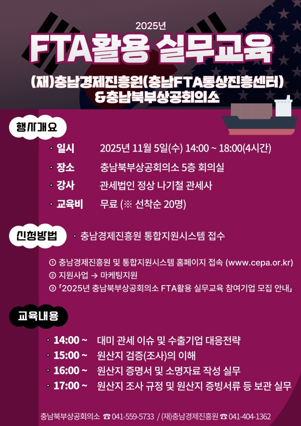 1. 일시: 2025. 11. 5.(수) 14:00 ~ 18:00(4시간) 2. 장소: 충남북부상공회의소 5층 회의실 3. 대상: FTA실무 담당자(※ 선착순 20명) 4. 주요내용 - 대미 관세 이슈 및 수출기업 대응전략 - 원산지 검증(조사)의 이해 - 원산지 증명서 및 소명자료 작성 실무 - 원산지 조사 규정 및 원산지 증빙서류 등 보관 실무 ※ 관세청 원산지관리전담자 교육실적 인정(6점) 5. 신청방법: 충남경제진흥원 통합지원 시스템 접수 ① 충남경제진흥원 및 통합지원시스템 홈페이지 접속 (www.cepa.or.kr) ② 지원사업 → 마케팅지원 ③ 「2025년 충남북부상공회의소 FTA활용 실무교육 참여기업 모집 안내」