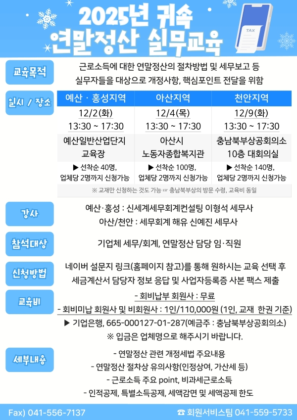 충남북부상공회의소에서는 아래와 같이 「2025년도 귀속 연말정산 실무교육」을 실시하오니 많은 참여 바랍니다. ※ 천안 교육은 선착순 접수 마감되었습니다 ※ ※ 공문 및 안내문을 꼭 확인하시고 교육 신청 바랍니다. ※ 천안/아산지역 모두 주차가 매우 혼잡하오니 되도록 대중교통을 이용하시어 교육 참석 바랍니다. ※ 신청인원 미달 시 폐강될 수 있습니다. (폐강 시 사전 연락)