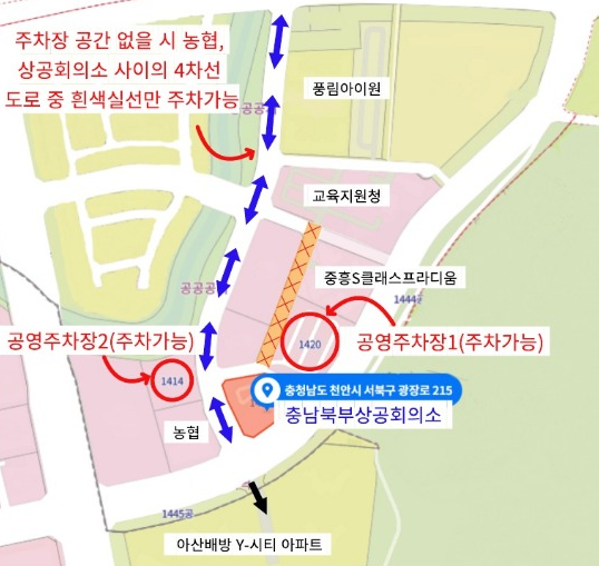 ◎ 주차공간 협소로 민원 발생 및 주차 단속에 유의해주시기 바라며, 가급적 대중교통을 이용해주시기 바랍니다. ◎ 주차장 공간 없을시 농협, 상공회의소 사이의 4차선 도로만 주차가능 ( 흰색실선 차선에만 주차 가능 ) ◎ 주차장 안내